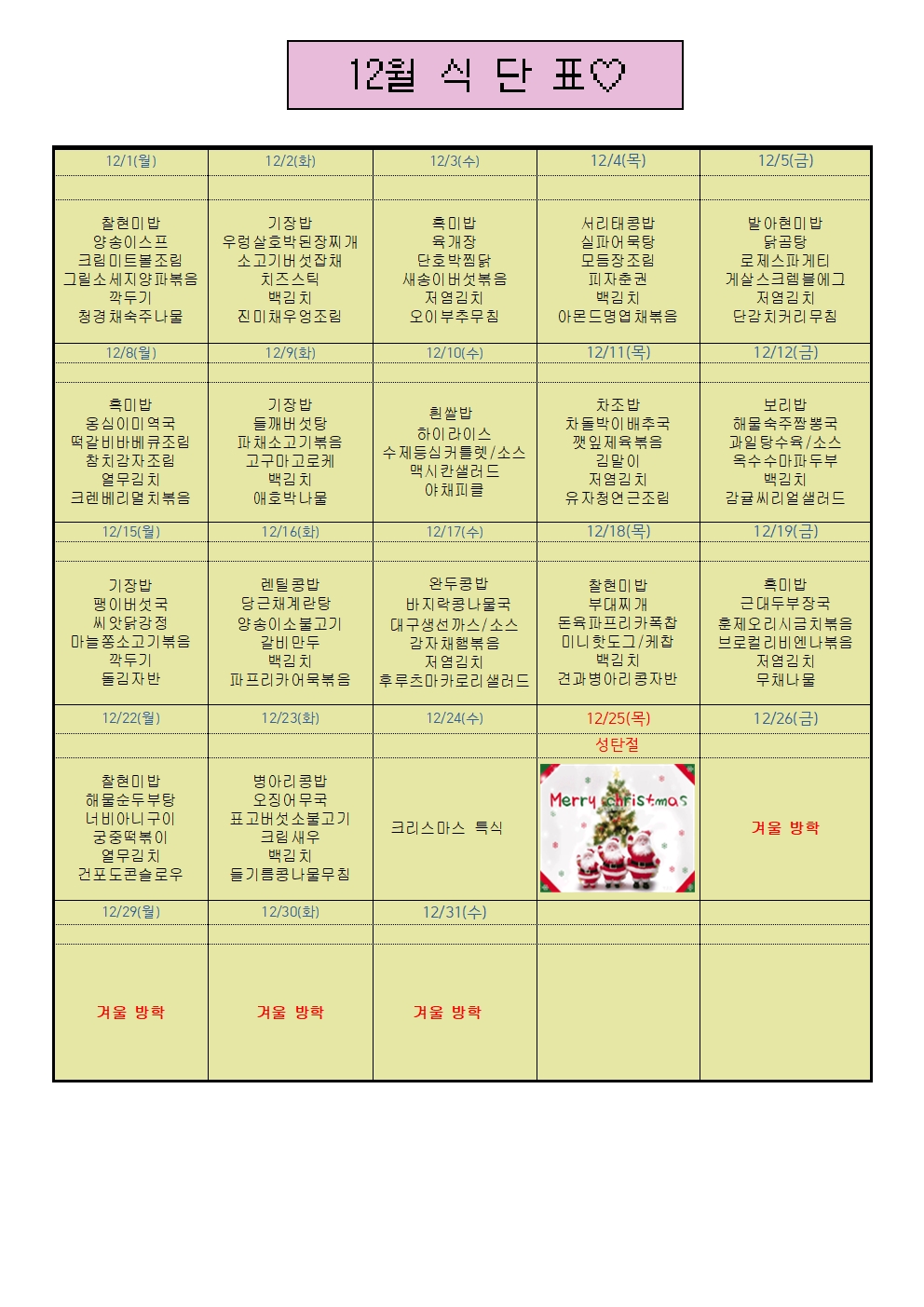 * À¯Ä¡ºÎ 12¿ù ½Ä´ÜÇ¥ *