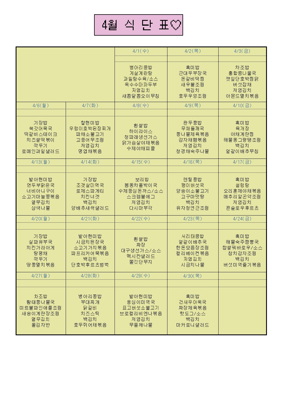 * À¯Ä¡ºÎ 04¿ù ½Ä´ÜÇ¥ *